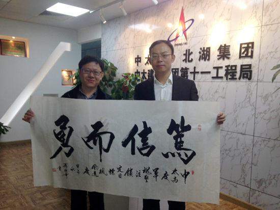 座談會結(jié)束后,傅強(qiáng)年會長有感而發(fā)為十一局題字“篤信而勇”,并附字“中太高度、軍魂塑鑄、鎖定目標(biāo)、標(biāo)楓速度”,以表達(dá)傅老對中太企業(yè)精神的感悟和贊頌。此外,傅強(qiáng)年會長還特別為十一局西藏項目贈詞《臨江仙.金爍布達(dá)拉》。(第十一工程局 供稿) |