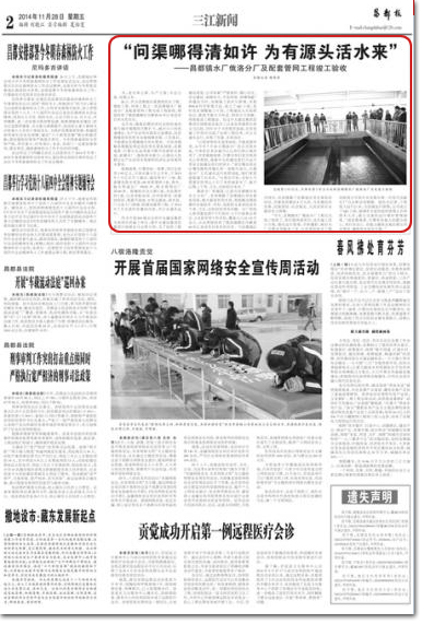根據地委、行署的統一部署,項目總投資1.93億元,日供水量3萬立方米,于2013年7月4日正式開工建設,建設凈水廠1座,配套建設取水壩及120米管架橋1座,取水、輸水管道總廠39023米,配水管網總廠22140米。修建綜合辦公樓1座,水處理車間1座,以及變配電間、反沖洗泵房、加氯加藥間、絮凝平流池、V型過濾池、清水池、門衛室大門圍墻、附屬設施等工程,于2014年7月20日完成所有建設內容,并正式通水運行。