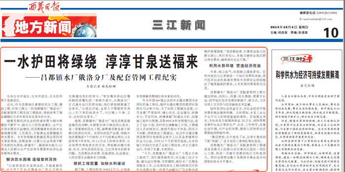 昌都鎮(zhèn)水廠俄洛分廠及配套管網(wǎng)工程建成是昌都為人民群眾辦實(shí)事而打造的一項(xiàng)民心工程,將進(jìn)一步提升昌都的吸引力和競爭力。同時(shí)也將帶動(dòng)整個(gè)昌都供水事業(yè)逐步向國家的供水水平看齊。 |