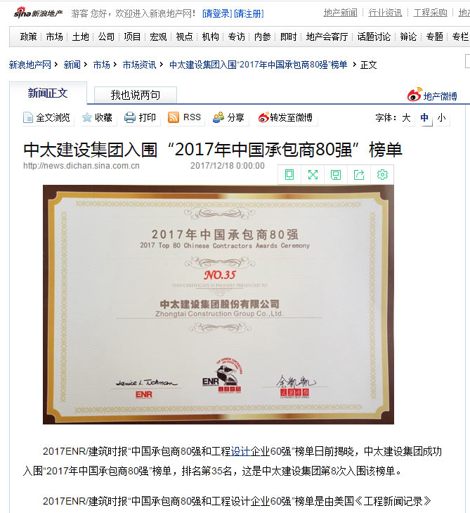 新浪網(wǎng)報道了“中太建設(shè)集團入圍“2017年中國承包商80強”榜單”