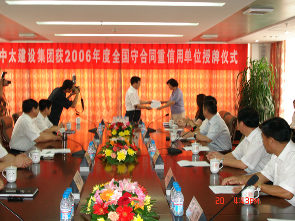 中太建設(shè)集團獲2006年度全國守合同重信用單位授牌儀式于2007年8月20日在中太大廈十六樓會議室舉行。河北省工商行政管理局受國家工商行政管理總局的委托,向中太建設(shè)集團授予獎牌。