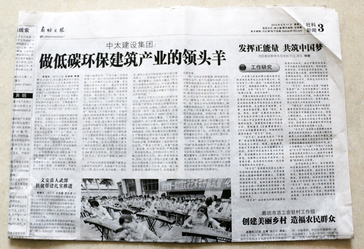 廊坊日報(bào)三版頭條報(bào)道了中太建設(shè)集團(tuán)做低碳環(huán)保建筑產(chǎn)業(yè)的領(lǐng)頭羊