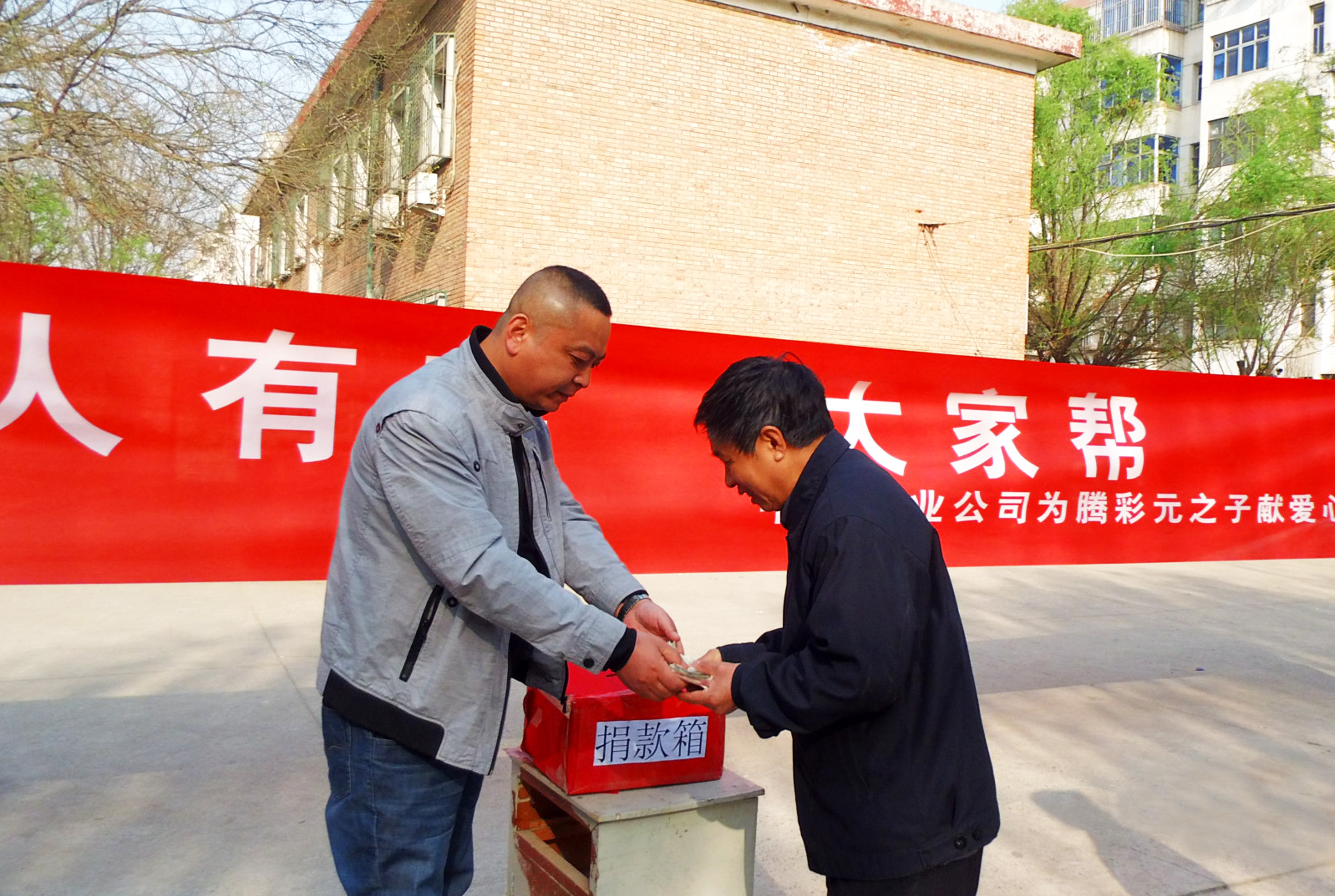 倡議一經(jīng)發(fā)出,廣大員工積極響應(yīng)、踴躍捐助,一時(shí)間,中太集團(tuán)公司內(nèi)部形成了一片“愛的海洋”。每位同事們都慷慨解囊盡力支持,500、300、200、100、50……雖然不多,但是每個(gè)人都用自己的實(shí)際行動(dòng),默默地向騰彩元一家表達(dá)著祝福與關(guān)切。因?yàn)轵v彩元早已退休,所以公司現(xiàn)在的很多員工并不認(rèn)識(shí)他本人,但愛心沒有界限,同事們并不在意。他們說,雖然沒見過其本人,但他和我們有一個(gè)共同的稱號(hào)“中太人”,同胞有難,我們理應(yīng)攜手共渡難關(guān)。中太集團(tuán)物業(yè)公司更是專門在小區(qū)里舉行了一場“為特困職工騰彩元捐款”的愛心募捐活動(dòng),大大的紅色條幅和身著工作服的保安、保潔人員分外引人注目,大家自覺排隊(duì)按順序走到捐款箱前一一獻(xiàn)出了自己的愛心。更有正在上崗的保安、保潔人員得知消息后,一到換崗時(shí)間馬上就趕到了捐助現(xiàn)場,掏出身上有零有整的錢盡數(shù)投到了捐款箱內(nèi)……在募捐現(xiàn)場,共集得善款4738元。雖然錢數(shù)不多,但是收入相對(duì)微薄的他們,并沒有吝嗇他們的大愛,“這百八十的對(duì)咱們來說算不了什么,但是人家還等著救命呢!”、“多少都是一點(diǎn)心意,幫幫這家人吧,太不容易了!”、“誰還能不趕上點(diǎn)事,能幫大伙兒就幫幫吧!”……他們的行動(dòng)感染著小區(qū)里的群眾,許多素不相識(shí)的人們?cè)诹私馇闆r后也都紛紛伸出了援助之手,一時(shí)間,小區(qū)里洋溢著濃濃的愛的氛圍。六公司、鋼結(jié)構(gòu)、三河分公司、十一局等單位也在第一時(shí)間響應(yīng)了集團(tuán)公司的倡議,紛紛慷慨解囊,截止到4月16日,集團(tuán)上下已捐得愛心款66290元,交到了騰彩元手里,給4月17日就要進(jìn)行手術(shù)的騰彩元一家,解了燃眉之急。